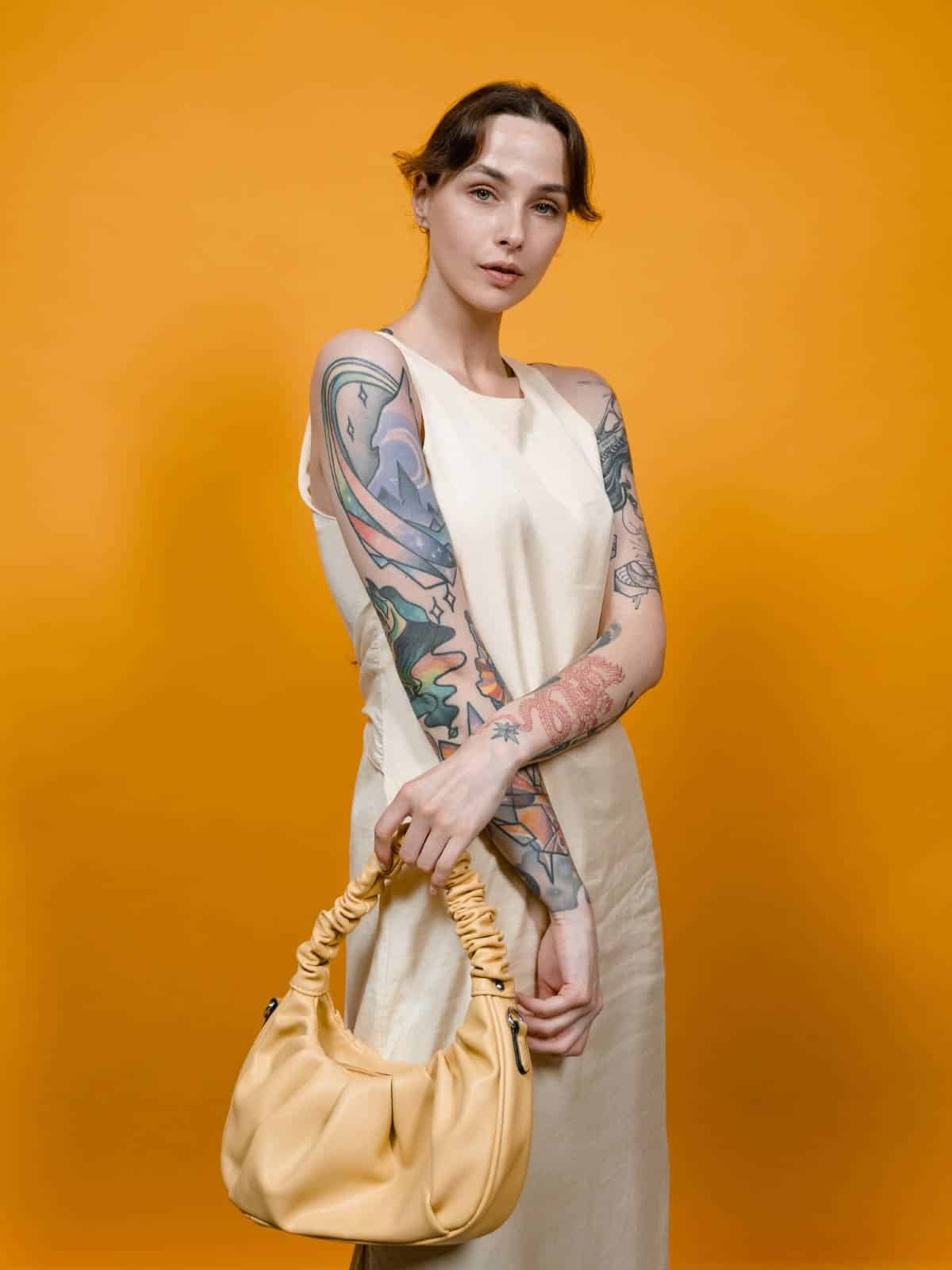 Le sac porté épaule jaune écoresponsable apporte une touche sophistiquée.